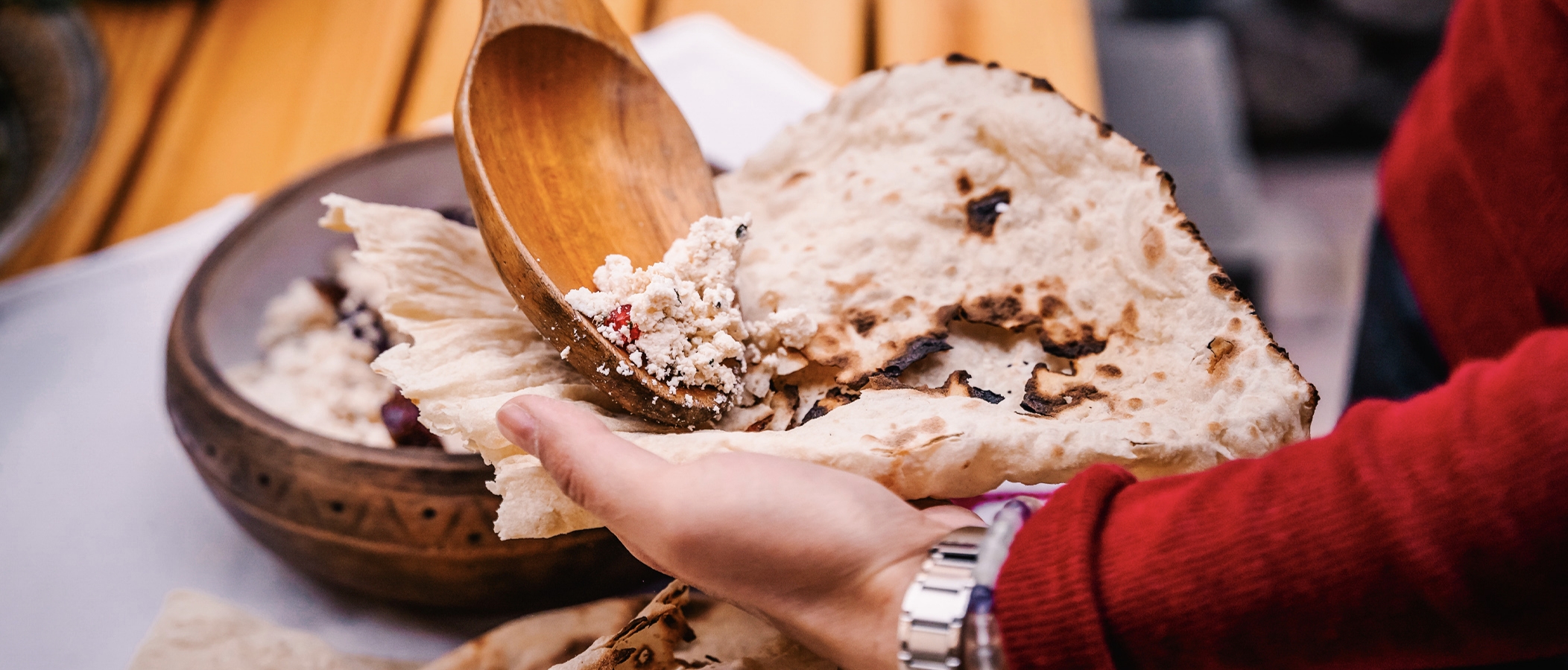 placed on the ground. You will watch a live demonstration of traditional flour making using traditional cooking tools, such as stone mortar and hand millstone. Then, it’s your turn to learn how to roll the dough near the Tonir, followed by tasting the freshly baked Lavash with cheese, fresh herbs and vegetables.